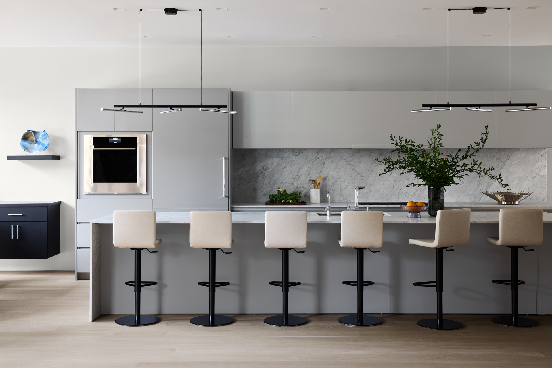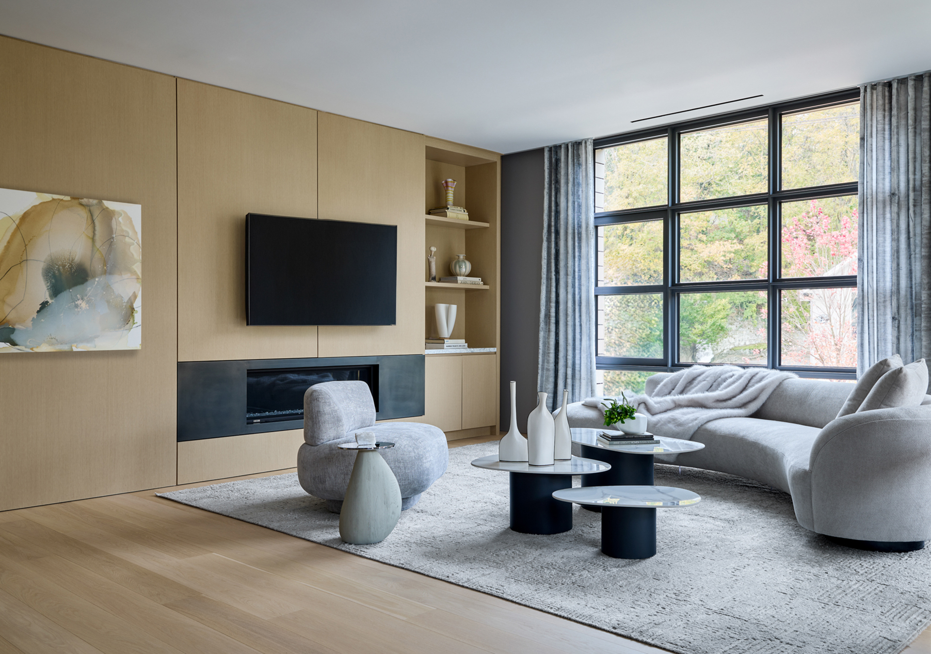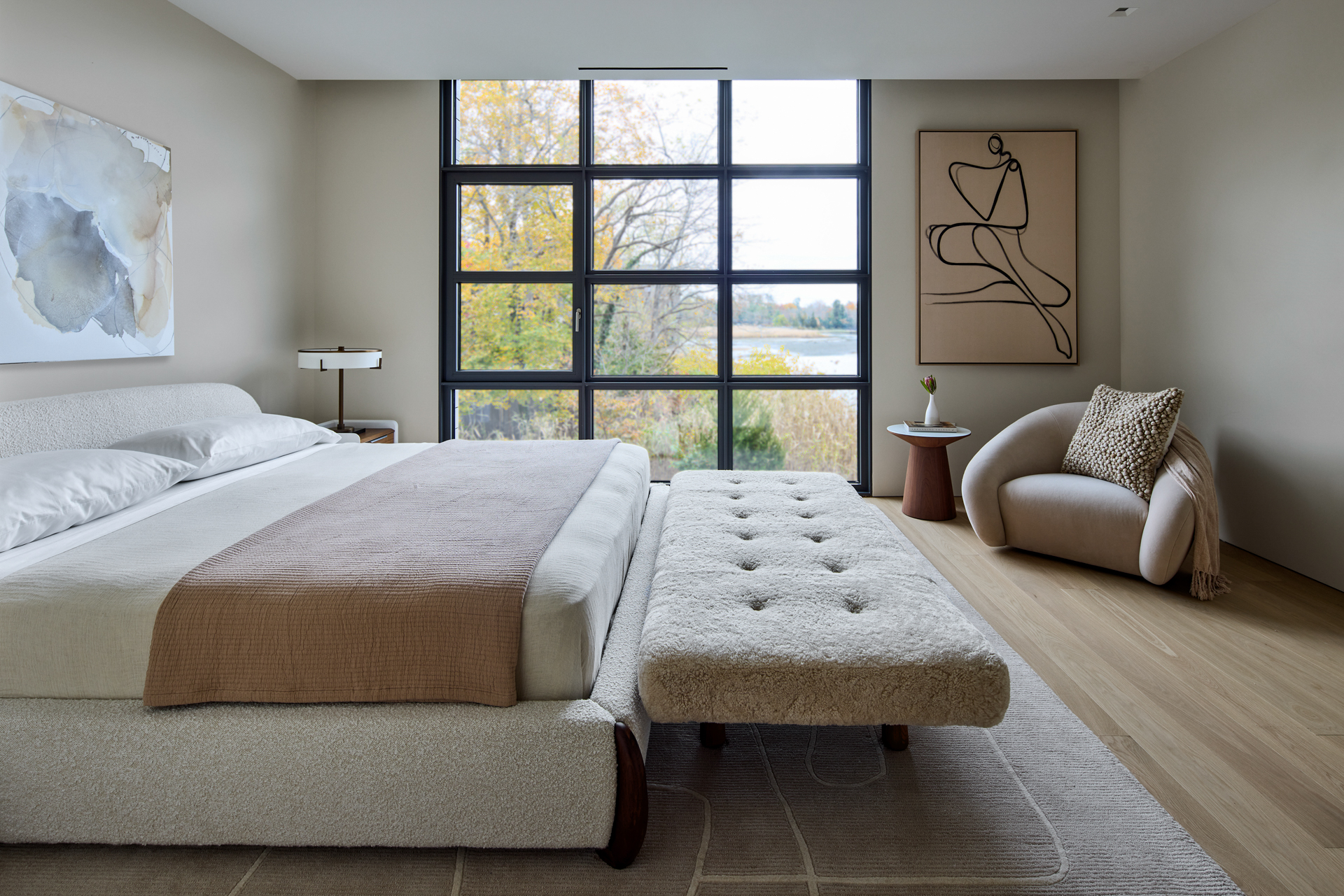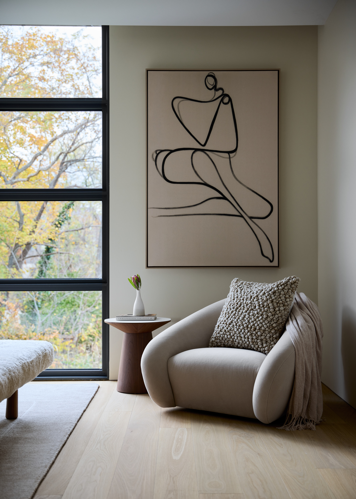 Tucked within a boutique building, this modern condo tempers its crisp, glass-lined architecture with gentle curvilinear forms and a soothing, sculptural quietude. A palette of white oak and warm greige creates an understated foundation, while blackened metal lends an architectural contrast. Cararra marble softens the modern lines with its natural veining and luminosity. Art curated through a local gallery adds depth and narrative, shaping the home into a refined study of comfort, contour, and contemporary elegance.