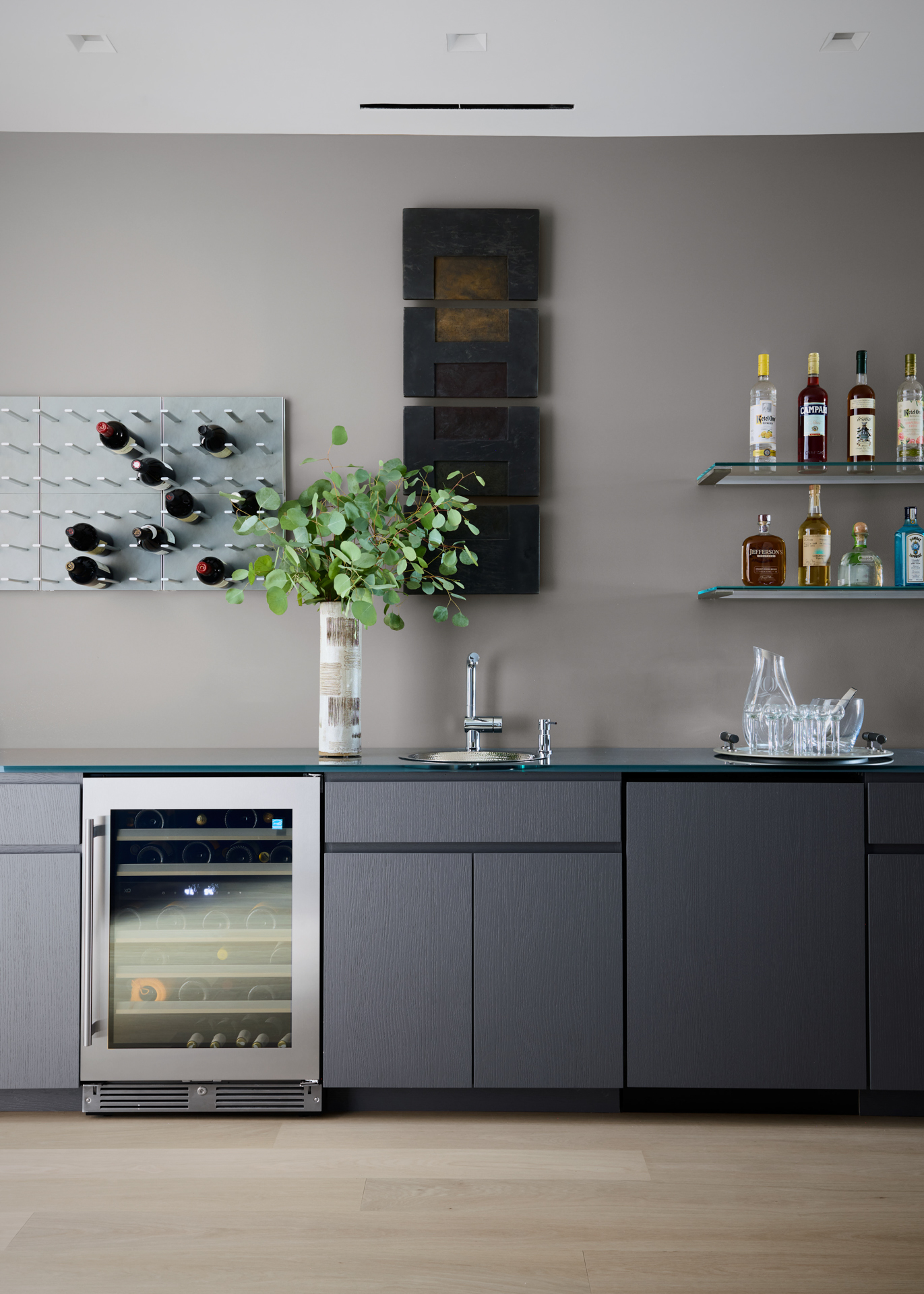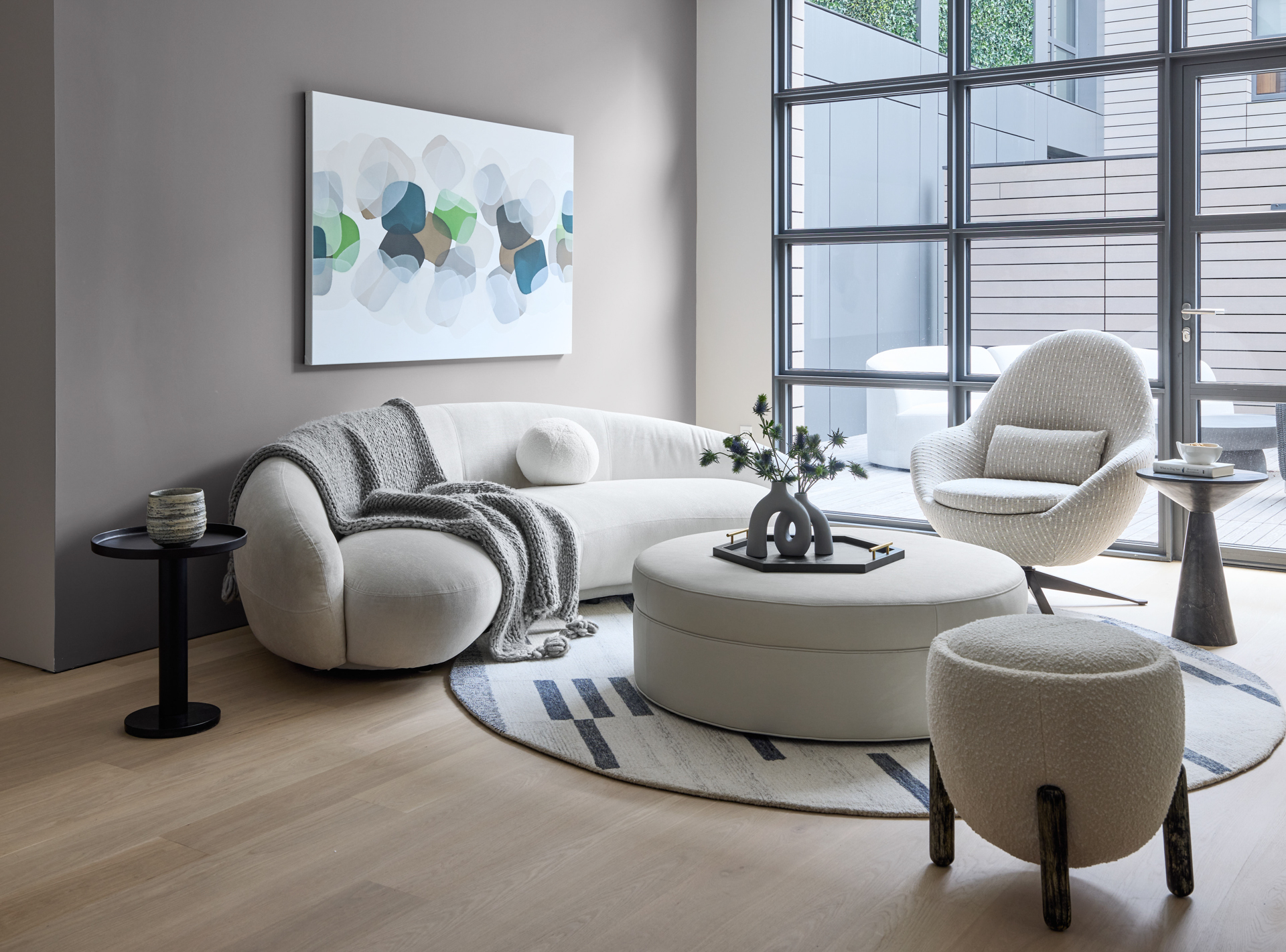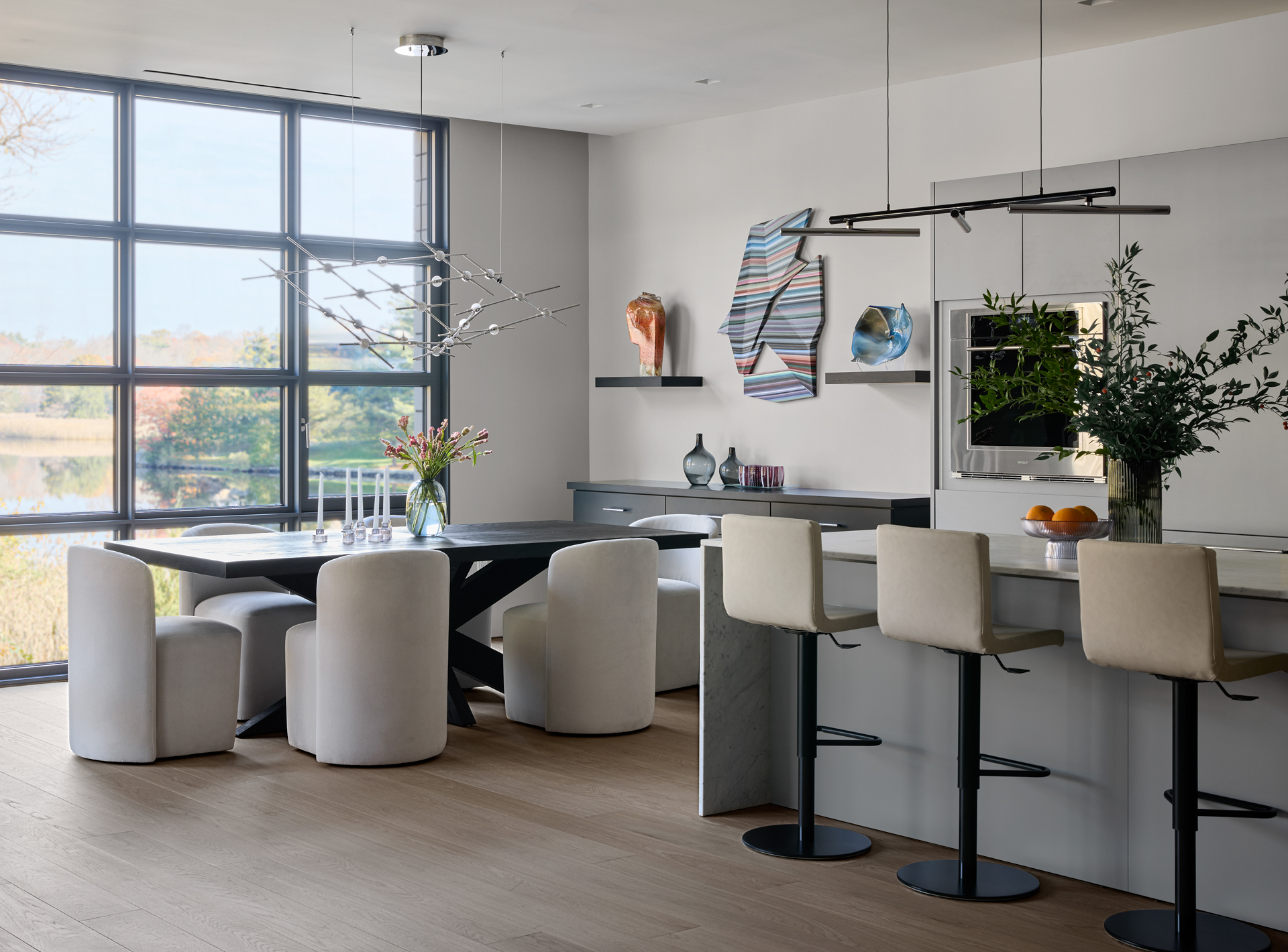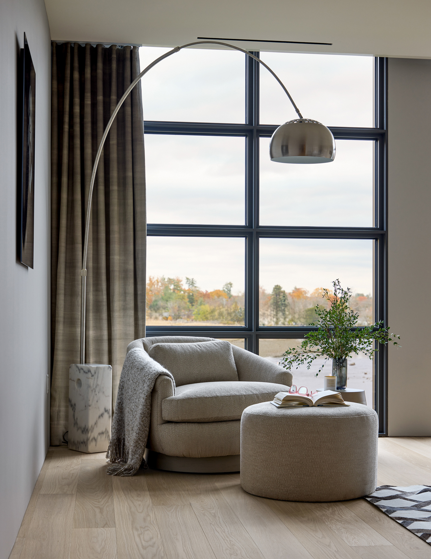 Tucked within a boutique building, this modern condo tempers its crisp, glass-lined architecture with gentle curvilinear forms and a soothing, sculptural quietude. A palette of white oak and warm greige creates an understated foundation, while blackened metal lends an architectural contrast. Cararra marble softens the modern lines with its natural veining and luminosity. Art curated through a local gallery adds depth and narrative, shaping the home into a refined study of comfort, contour, and contemporary elegance.